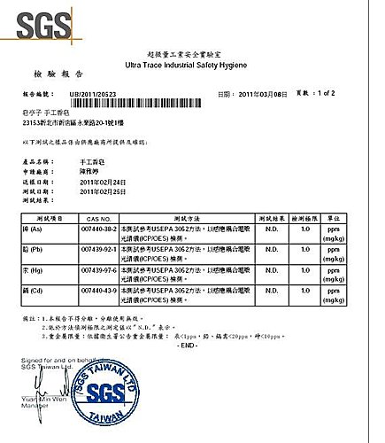 為了讓客戶可以更放心選購我們的手工皂產品,手工皂材料及將珍貴的母乳妥託我們代製,我們主動申請全球最大品質驗証組織(SGS),為國內首家官方認可的ISO檢証機構,經檢驗後”皂亭子手工香皂”通過四大重金屬皆未驗出的合格認証,雖然我們沒有每批製作出的手工皂都拿去檢驗(因為送檢費用實在不便宜)但我們相信只要原料廠商(有品質信譽的)是不變的,再掌控好手工皂製作流程,做出的手工皂就不會有問題了!與好的原料廠商長期的配合,才有辦法製作出好品質的手工皂!我們也是秉持著做手工皂的初衷,做出好品質的手工皂解決大家皮膚的問題,這真是一個良心事業啊!